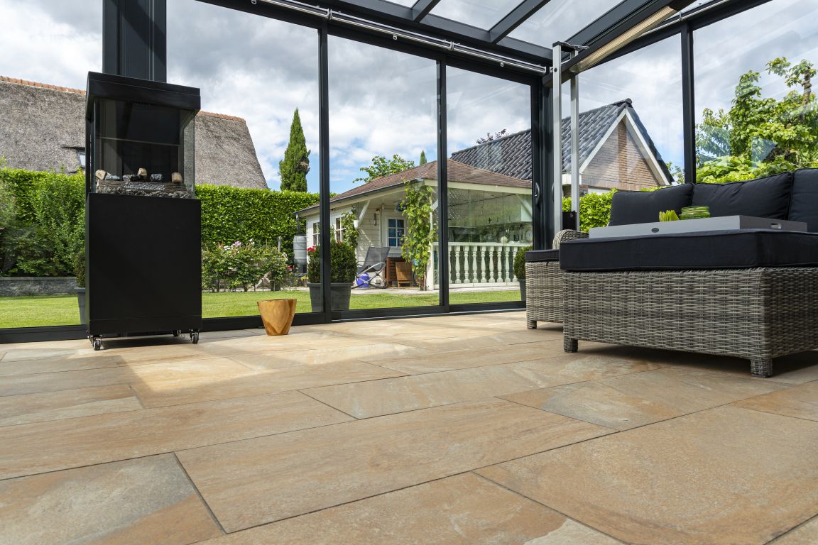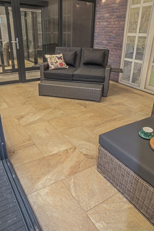 Is een hoogwaardige keramische tegel die permanent verbonden is met een betontegel. Zijn aanzienlijk goedkoper te verwerken dan traditionele keramische tegels, omdat ze niet in een met cement gemengde ondergrond gelegd hoeven te worden. Een ondergrond van zand of split, zoals gebruikelijk bij betontegels, is voldoende.
