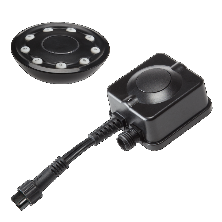 Met de afstandsbediening zet je op afstand de buitenverlichting aan of uit. Op één afstandsbediening kun je tot wel 9 ontvangers aansluiten. Extra ontvangers zijn los verkrijgbaar. De afstandsbediening werkt op radio-frequentie en heeft een bereik tot ca. 40 meter (in open terrein). Artikelnummer: 166A